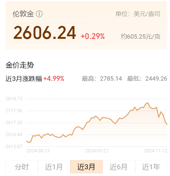 从10月30日的最高点2785美元,跌至昨天的2605美元,10天左右跌了6.5%。