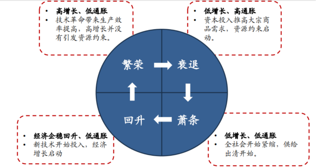 康波周期一轮是60年的时间,分4个阶段:回升、繁荣、衰退、萧条,周而复始,因果轮回;