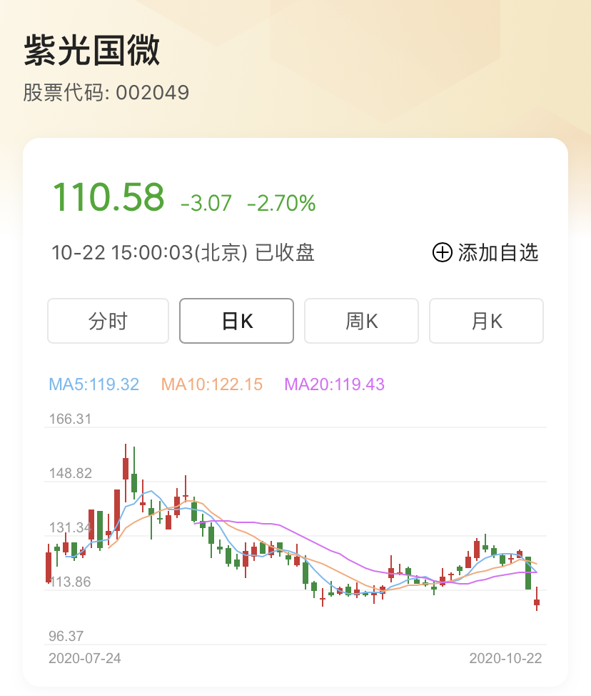 这两天,芯片龙头企业紫光国微上热门了。股价从124元跌到了110元,昨天直接跌停了,市值一下缩水近百亿。