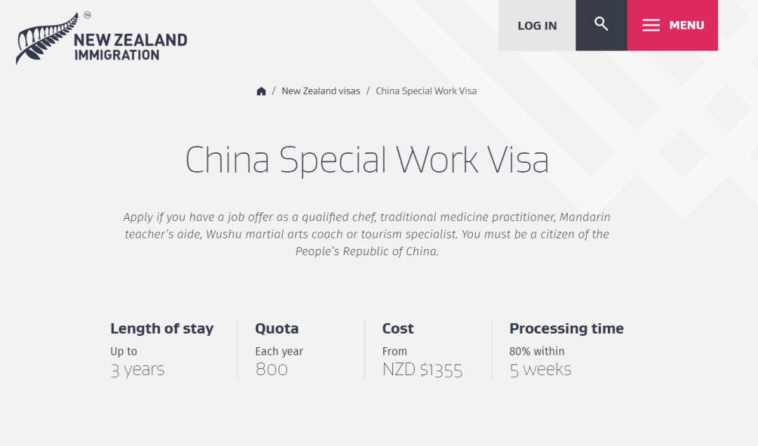 At any one time under the China Special Work Category, New Zealand can have: 200 Chinese chefs, 75 traditional Chinese medicine practitioners, 300 Mandarin teacher’s aides, 25 Wushu martial arts coaches, 200 Chinese tourism specialists.