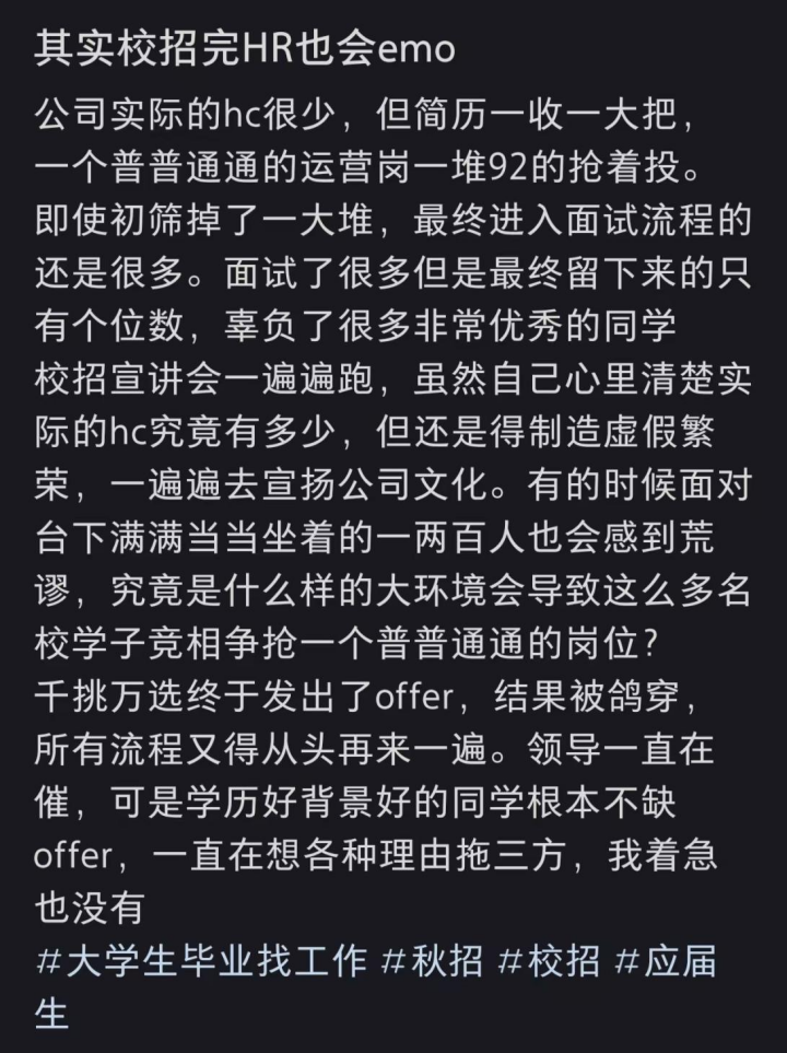 毕业生们普遍吐槽许多知名企业的秋招“开了个寂寞”,招聘岗位极少,需求人员极少,招聘流程极长。现在的双选会、招聘会再也不是面对面坐下来好好聊聊彼此情况,寻找适合企业的人员,而是一次材料上交会。