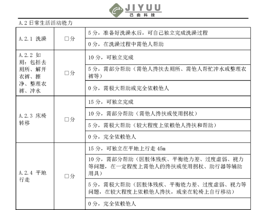 因此,Mia会和客户一起填写一份问卷,洗澡、如厕、从床上移动到轮椅、平地行走等都有从0分到15分的评分标准,通过一问一答的形式,尽量覆盖到老人生活的方方面面。