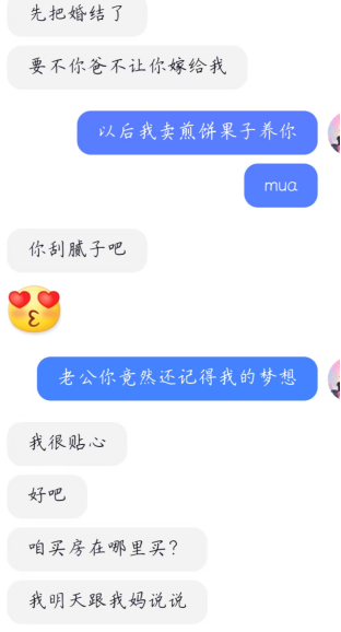 谈及未来,男友或许会通过入伍考军校的方式提升学历,未来也能顺利进入编制,有一份稳定且能养活自己的工作。在她对未知感到焦虑时,他会说“宝宝,我们一起开辟一个美好的未来,以后我来守护你好吗?”