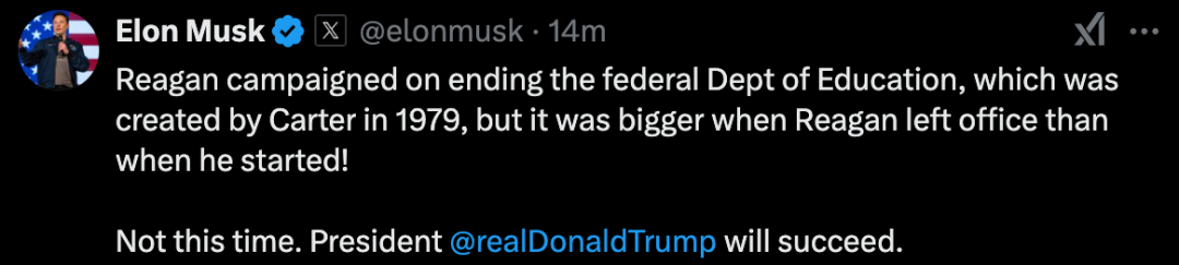 我查了一下报道,马斯克并非开玩笑(相信经过这两周,相信已经没人再怀疑这家伙现在手里的权力了),华盛顿邮报说,壮普准备下令解散教育部,同时DOGE正在调查数据。