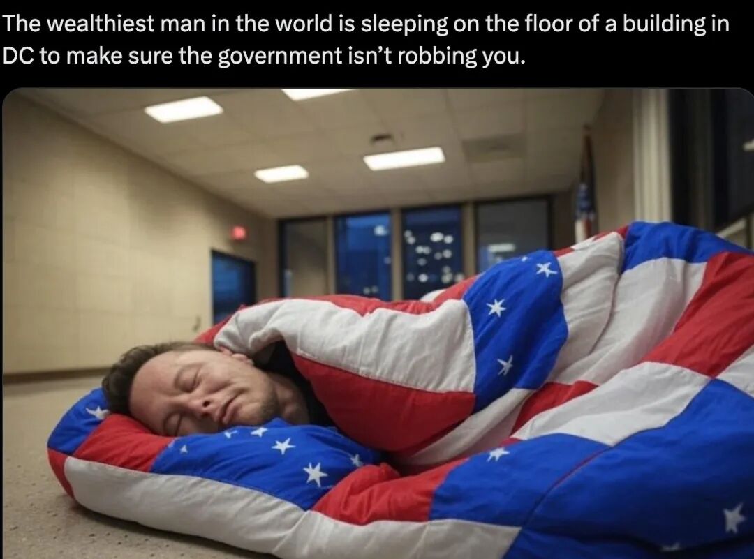 此外,昨天网上开始流传一张马斯克为了DOGE工作睡地板的照片,这张照片带有明显的AI制作的标志,但社交媒体上大量的转发,还是让它被很多人误以为真。