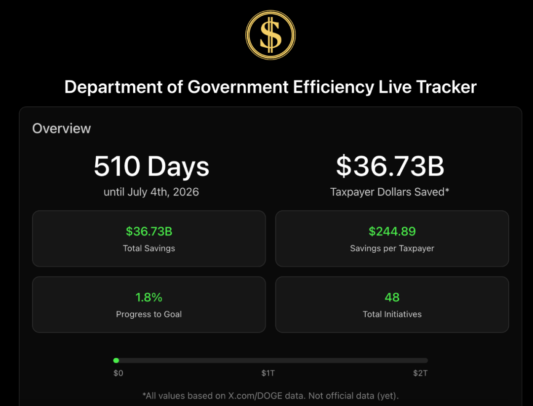 鉴于此类日常被中止的项目越来越多,有人根据各类公开信息制作了一个网站,实时更新DOGE的进展和完成进度。数据显示,截至目前,DOGE已经直接砍掉了367亿美金预算。