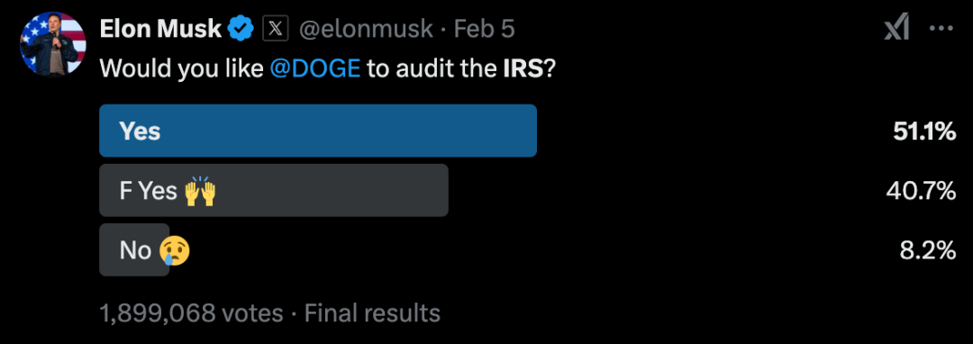 马斯克还发起了一项投票,了解是否愿意让DOGE审计美国内税务局(IRS)。截至今日,有近190万人参与了投票,有近92%选择支持。