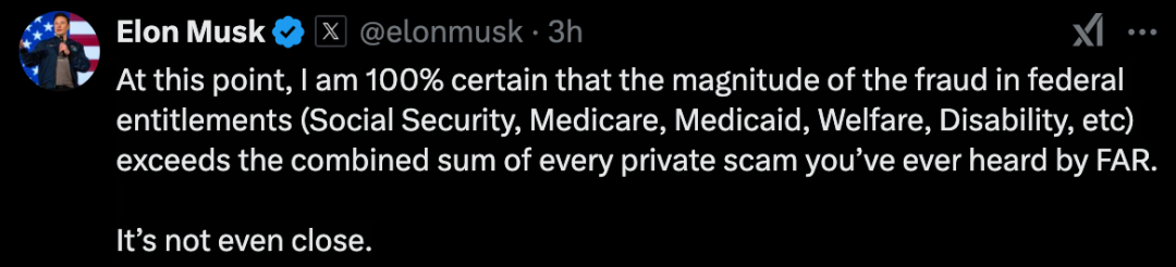 今天下午,马斯克语出惊人,“此刻,我百分之百确定联邦福利(社会保障、医疗保险、医疗补助、福利、残疾等)中的欺诈规模远远超过了你们听说过的。”