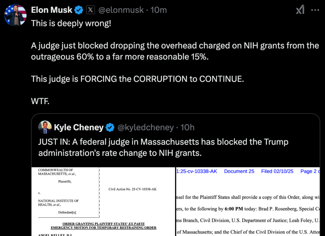果然,在入驻美国国家卫生研究院(NIH)不久之后,这家原本年预算超400亿美金的机构就被告知需要将管理费从60%削减到15%左右。但是,2月10日,该决定被联邦法官驳回,怒不可遏的马斯克回应: