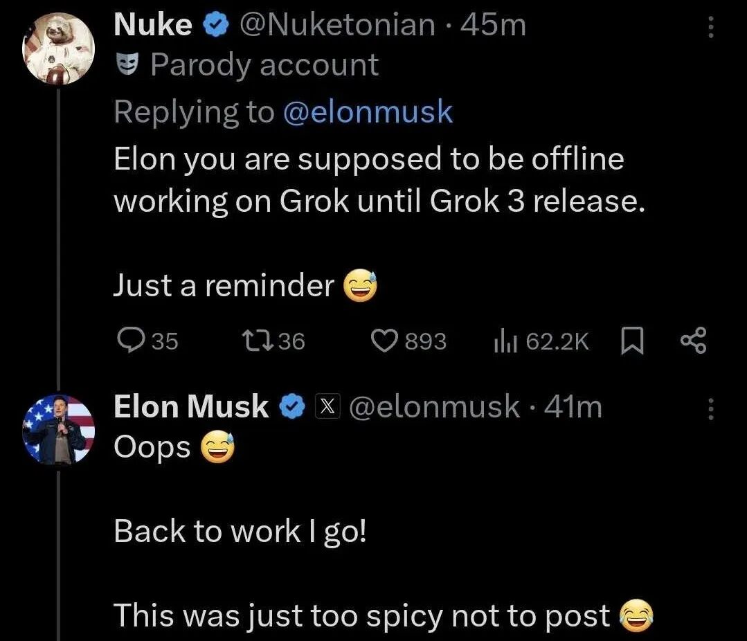 昨天,马斯克信誓旦旦公开发帖,他要断网三天,和团队一起工作,直到Grok3发布。