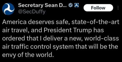 交通部的公告中说,总统已命令我们提供一个世界一流的空中交通管制系统,让全球羡慕。为此,我们需要美国最聪明的人才的建议。