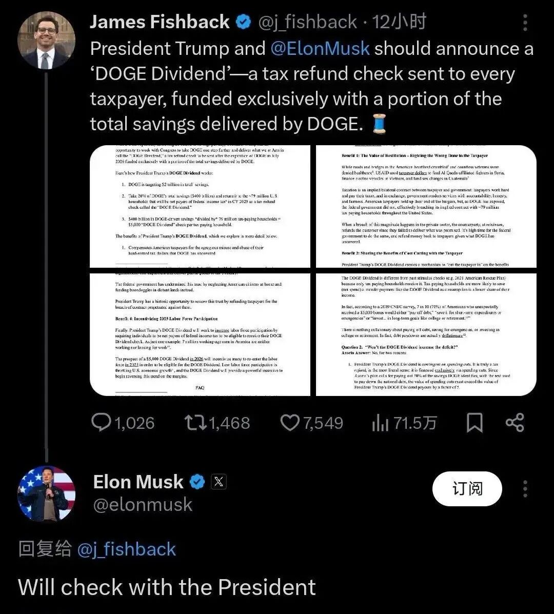 这个方案是昨天美国投资公司Azoria的CEO詹姆斯·费什巴克(James Fishback)在X上提出的。马斯克看到后回复:“会和总统确认。”