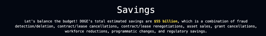 根据DOGE官网公布的数据,截至目前,已省下的费用总额为550亿美金。这些节省主要来自拨款取消、人员削减、欺诈取消、合同/租约取消、合同/租约重新谈判、项目变更以及监管节省。