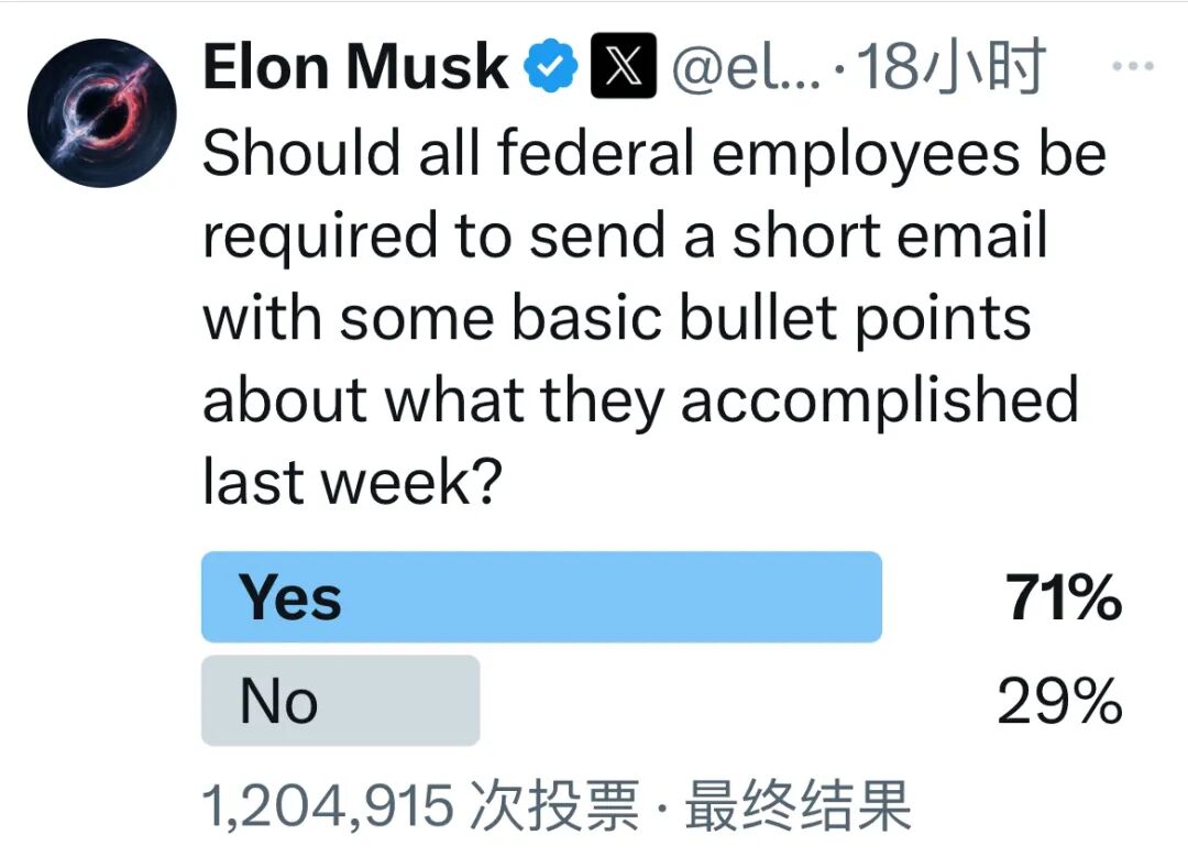 马斯克还在X上发起了一项投票,120多万参与者中71%认为联邦雇员应该回复“过去一周干了什么?”
