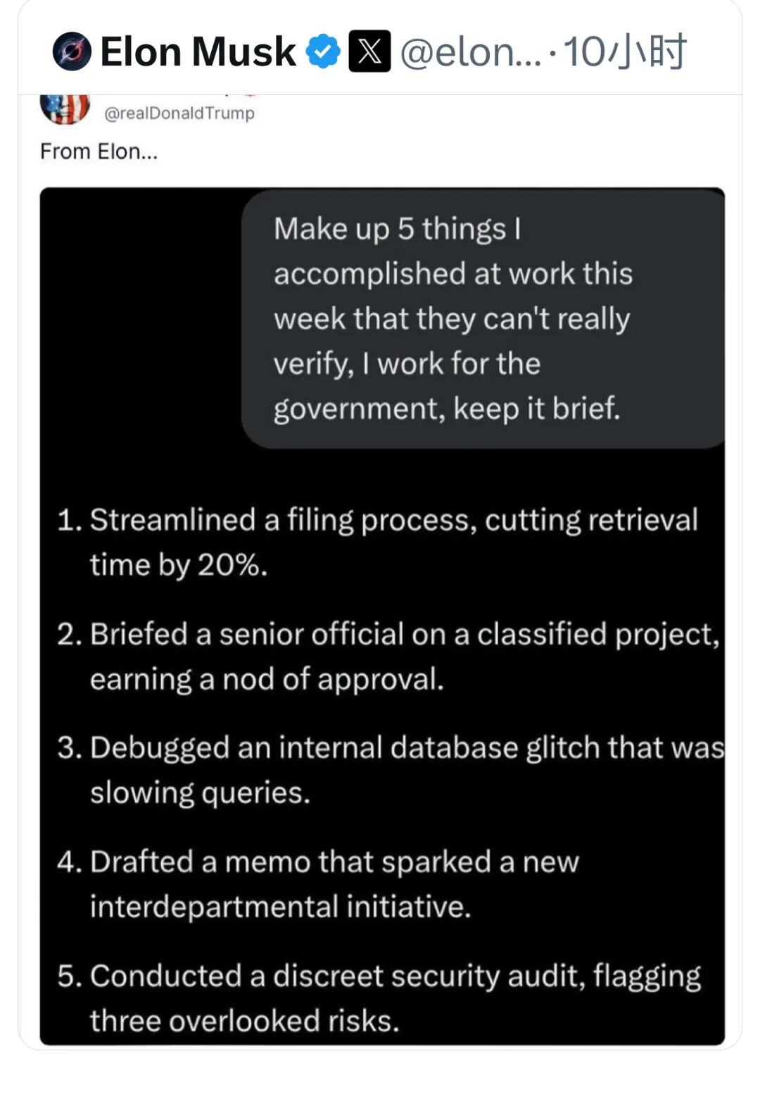 壮普则公开贴出了一份马斯克发给他的周报,列出了5条过去一周完成的工作。