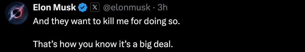 经过一个月的折腾,马斯克也感到了前所未有的压力。他在回复一个帖子时说,“他们甚至想因此杀了我。”