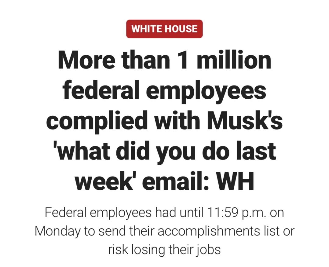 白宫新闻秘书卡罗琳在周二的新闻发布会上表示,在截止时间前,超过100万联邦雇员回复了“你上周做了什么”邮件。