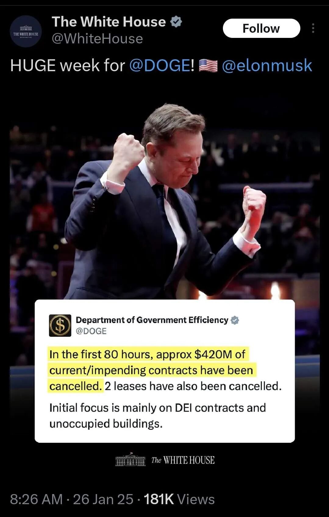 话说,今天除了白宫的账号转贴了一把政府效率部的帖子外,狗狗效率部终于在周末消停了一会儿。差评,周末不上班,不符合马斯克硬核工作制的要求[捂脸]