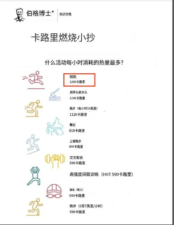生长激素和脂肪燃烧生长激素可以帮助减少胰岛素抵抗,帮助增加肌肉,帮助燃烧更多脂肪。即使全速冲刺只能坚持10到15秒,然后中间休息了4分钟,期间并没有燃烧很多卡路里,但冲刺后24到48小时后,睡觉时生长激素会增加,所以在睡觉时也会燃烧脂肪。因此,必须超越燃烧卡路里的机制,因为还有其他因素参与其中。减肥的最佳运动很多减肥者常犯的重大错误:试图通过运动来燃烧卡路里,但饮食中的碳水化合物含量过高。因此,他们最终会燃烧掉糖分,但运动后又渴望吃甜食和糖,于是又把碳水化合物重新摄入体内。所以他们从来没有真正减掉体重,因为他们的身体在依靠葡萄糖运行,只是在不断补充葡萄糖而已。如果要减肥,运动只占15%,而饮食则占85%。专注于燃烧脂肪卡路里是更明智的做法。而不是通过增加新陈代谢来燃烧更多的糖卡路里,然后又用糖来代替,这没有意义。如果我们想要进行一种能燃烧最多卡路里的运动,应该尽可能地保持最高强度,并尽可能多地使用肌肉,包括上半身和下半身肌肉。