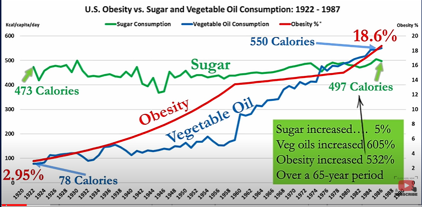 大部分糖的摄入量都来自于已公开发表的研究数据。1922年,美国人的糖摄入量已达到473卡路里,直到1987年,糖的摄入量为497卡路里。从1922年到1987年,只增加了24卡路里的微小变化。在19世纪末期,18至80岁男性的肥胖率为1.1%。但到了1987年,肥胖率已增加到18.6%%。也就是在1922-1987年间,糖的摄入量几乎没变,只增加了5%,而种子油的摄入量增加了65%,导致肥胖增加了600%!
