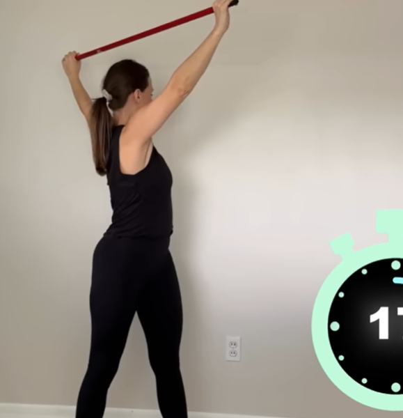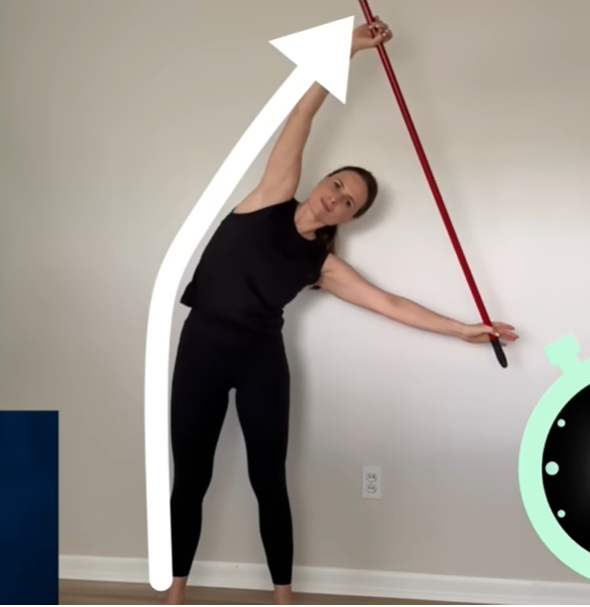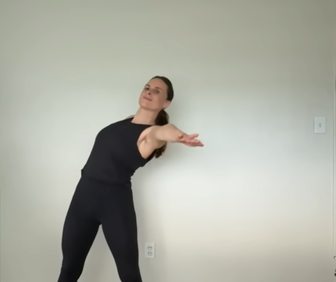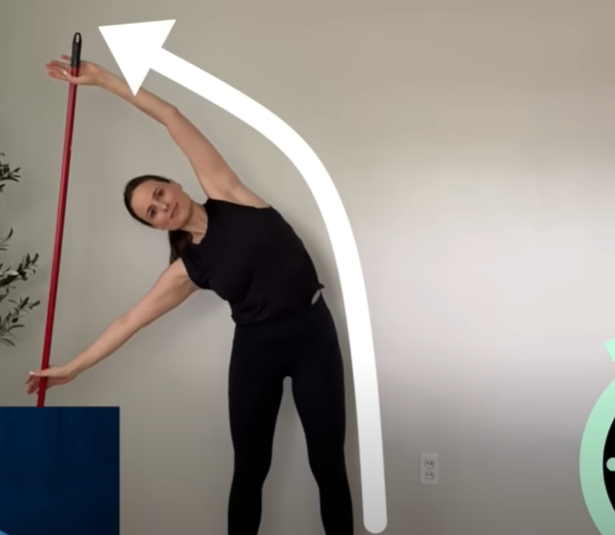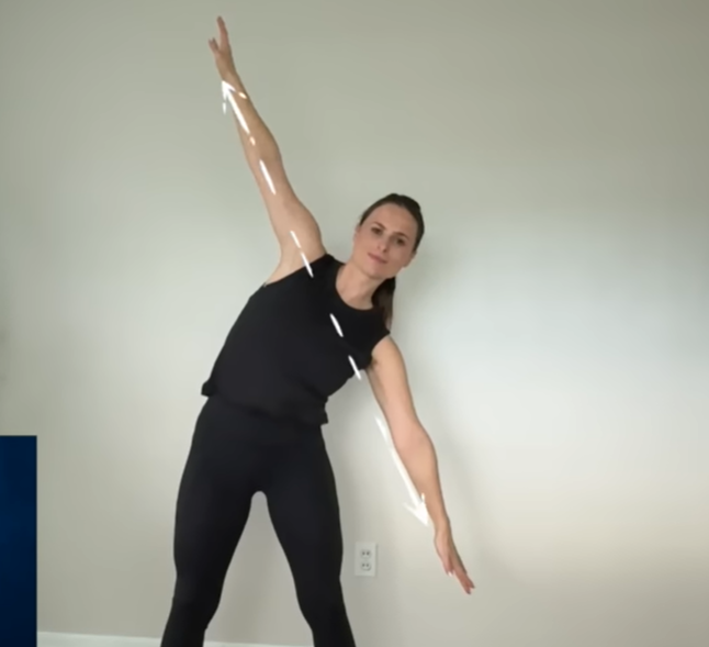 第一个动作:左右横向拉伸。(如下图)向一侧横向弯曲,同时将弹性带尽可能地往后拉。可以先从右侧开始,然后回到中间位置,再做左侧。