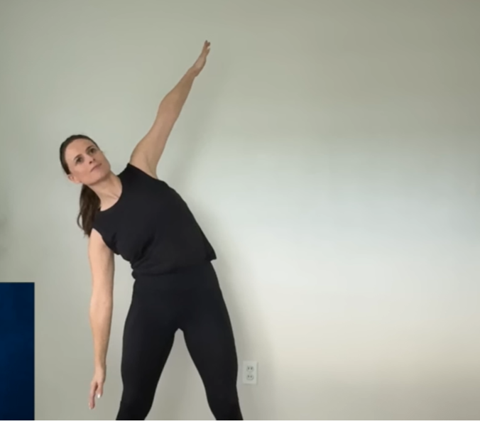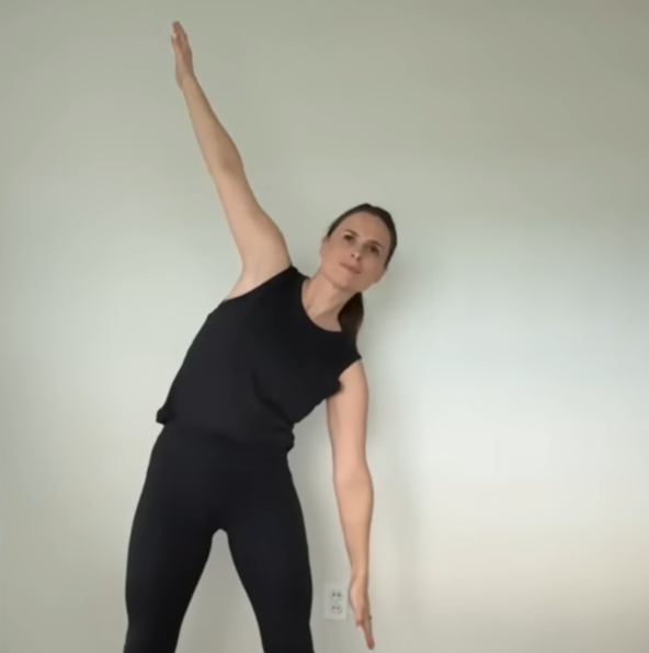 确保双腿分开与肩同宽,将手臂向两侧伸展,首先向左侧弯曲,手臂保持向两侧伸展。