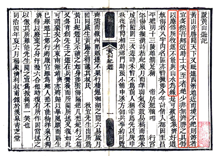 “黄山奇胜闻天下......游者宜多。然吾乡近时士夫至者绝少,非无济胜之具,特以尘俗所役,遂不能与山水为缘。”