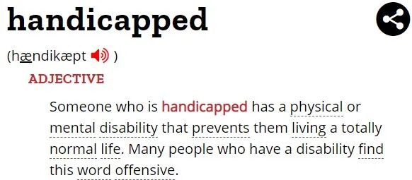英文词典里还特别提醒到,“这个词被很多残疾人士认为是无礼冒犯(offensive)的”。