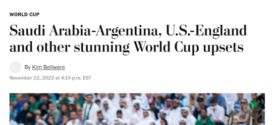 华盛顿邮报将沙特阿拉伯队与阿根廷队的比赛描述为“惊人的世界杯颠覆性事件” 图源:华盛顿邮报