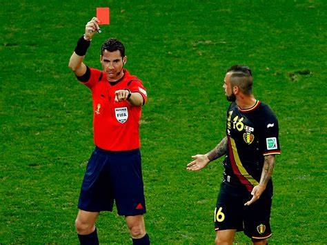 当一名球员因犯规而被警告时,会被出示一张黄牌(yellow card),这意味着被记名(to get booked)。如果被出示两张黄牌或因严重犯规行为而被出示一张红牌(red card)时,球员就会被罚下场(to be sent off)。