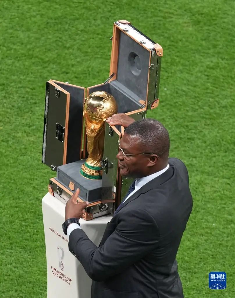 11月20日,法国队名宿德塞利在海湾球场展示大力神杯 图源:新华社
