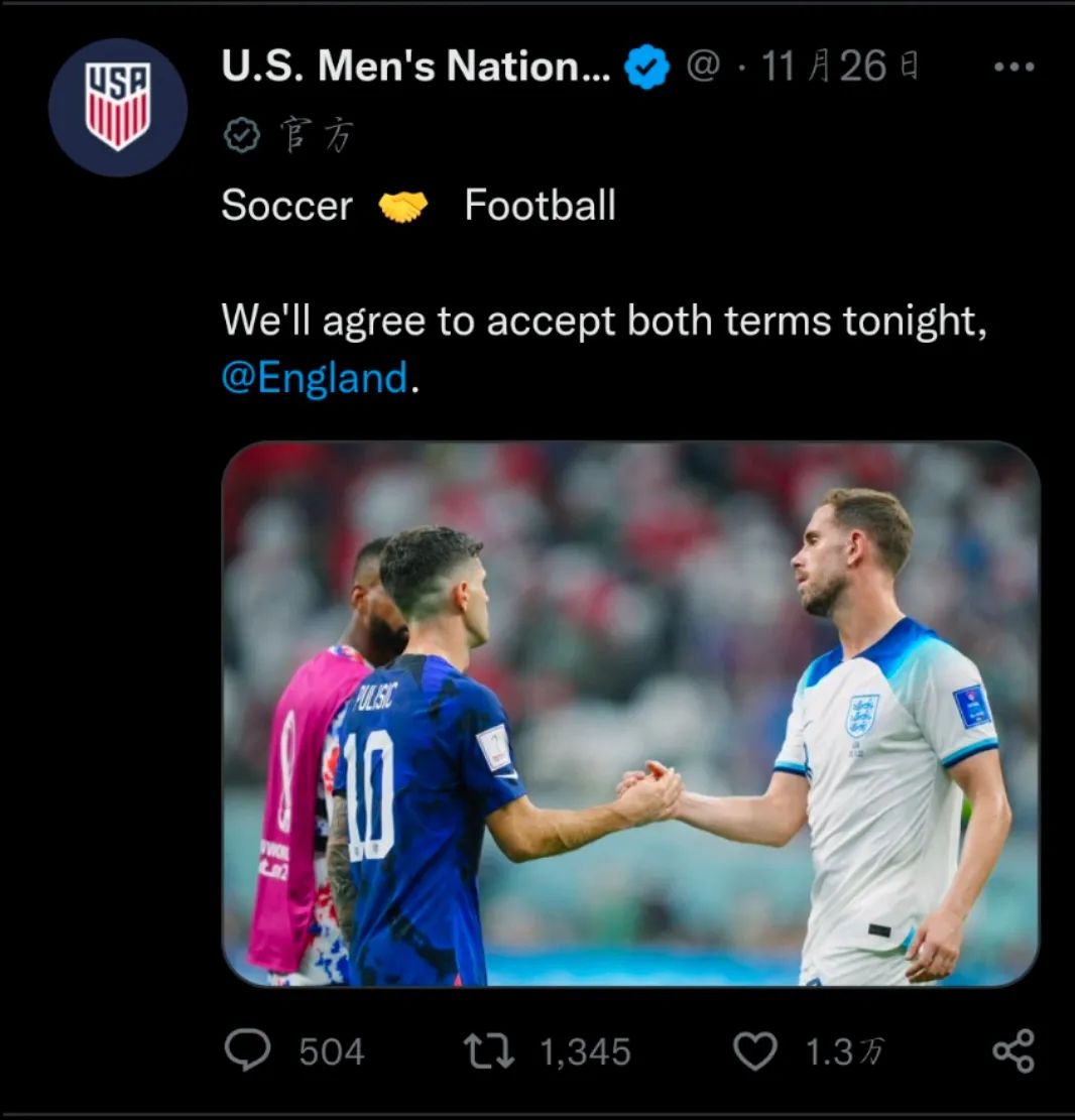 就在前不久的世界杯上,英格兰队与美国队0:0战平。赛前,双方球迷就football与soccer之争吵得不可开交。赛后,美国国家男子足球队官推晒出了亨德森与普利西奇握手的照片,并写道:“Soccer和Football握手言和,我们今晚同意两个词都是对的。”