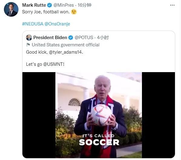 赛后,荷兰首相马克·吕特发推特回复拜登:“抱歉啊乔(拜登),football赢了。”(Sorry Joe, football won.)