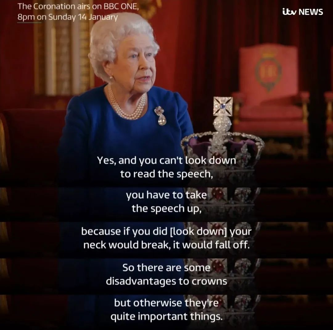 欲戴王冠,必承其重,伊丽莎白女王就曾在BBC纪录片《加冕礼》(The Coronation)中耿直吐槽:别低头,王冠会掉。
