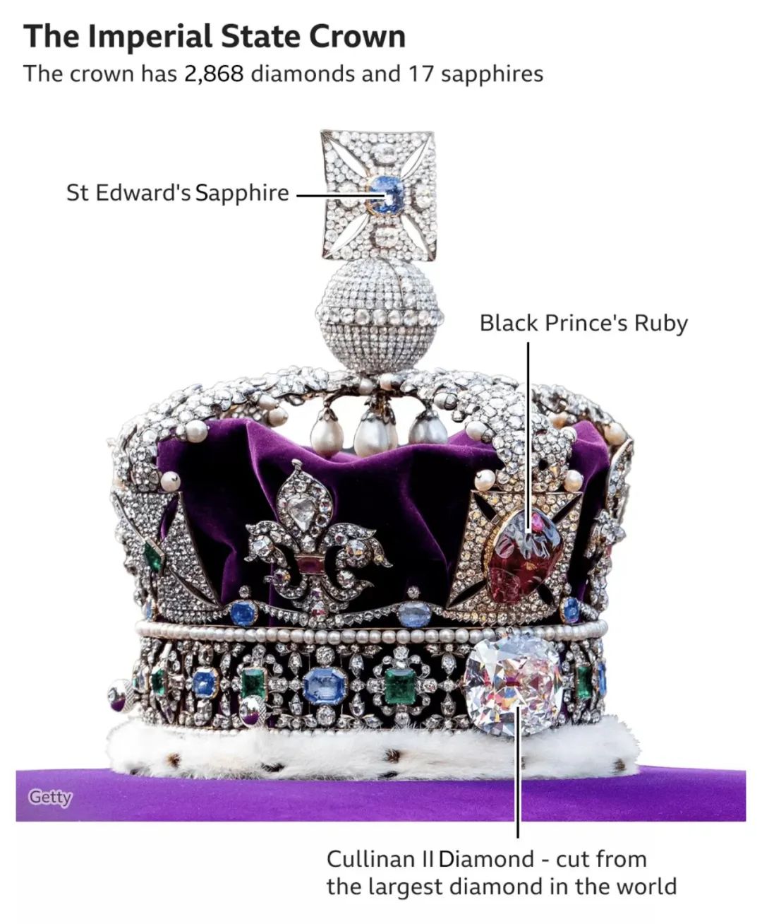 王冠在1838年制成,在1937年为国王乔治六世的加冕礼而重制,王冠上镶嵌了近3000颗宝石,其中包括著名的库里南二世钻石,重达1.06公斤。