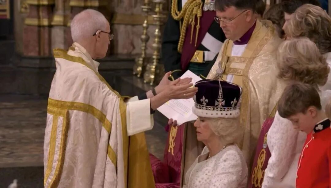 卡米拉在仪式上加冕为王后,出于效率和可持续的原则,她选择佩戴玛丽王后的王冠,该王冠最早被用在1911年玛丽王后的加冕礼。