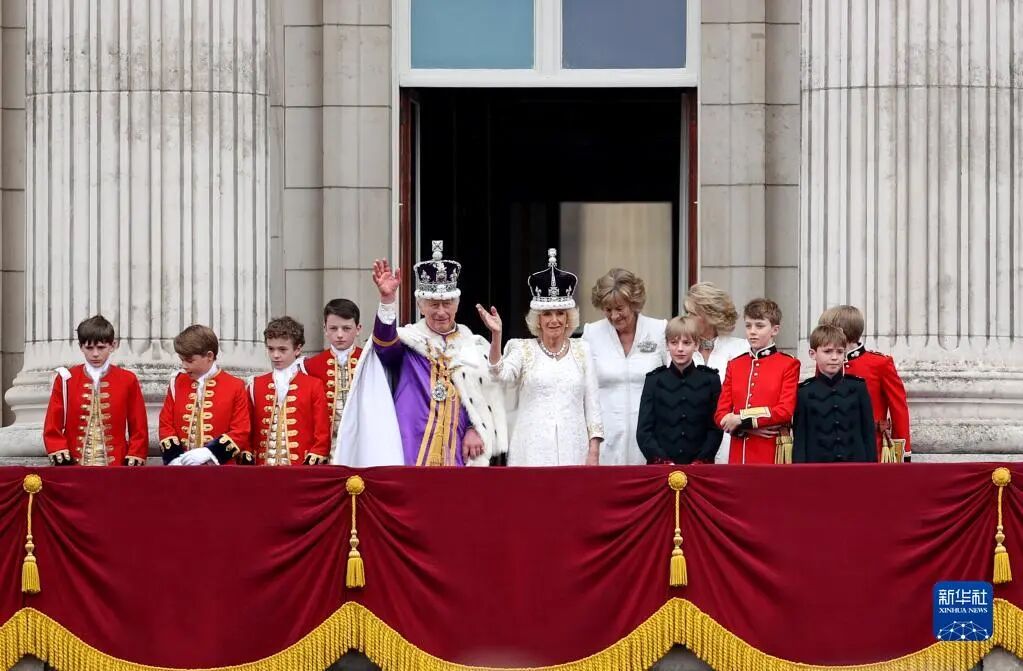 5月6日,在英国伦敦,英国国王查尔斯三世和王后卡米拉加冕后在白金汉宫阳台向民众挥手致意。图源:新华社