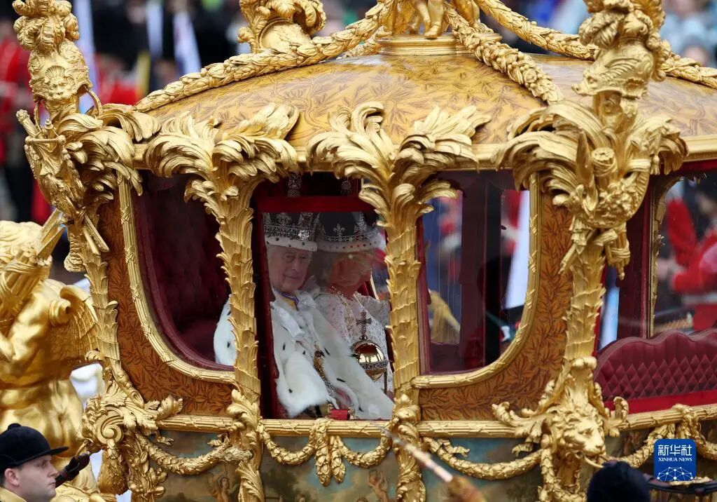 5月6日,在英国伦敦,英国国王查尔斯三世和王后卡米拉乘马车从威斯敏斯特教堂返回白金汉宫。图源:新华社