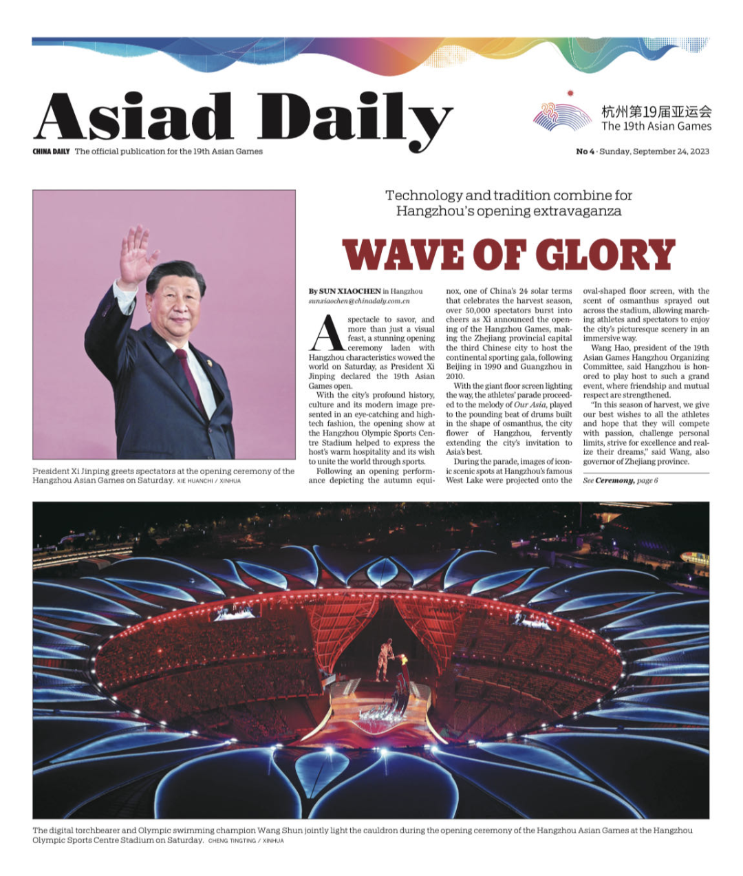 封面主图中,国家主席挥手 (wave) 致意,和波浪 (wave)双关,形容亚运会开幕式现场洋溢着如潮水般的荣耀和自豪感!