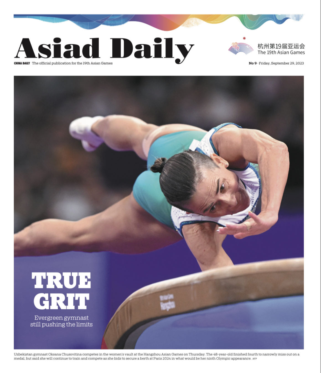 来自乌兹别克斯坦48岁的体操老将丘索维金娜再次登上亚运赛场,虽然她未能赢得奖牌,但是她的坚持和对体操的热爱感动了赛场内外,使她成为杭州亚运会中最受关注的运动员之一。True Grit是一部2010年美国电影,意为“真正的勇气”,借由这个标题,特别向这位传奇老将致敬。