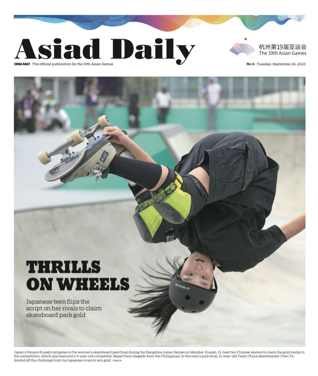 当天最新加入亚运会的滑板项目决出了金牌,编辑用了两个尾音相近的单词thrill和wheel组成了标题“轮子上颤栗”。