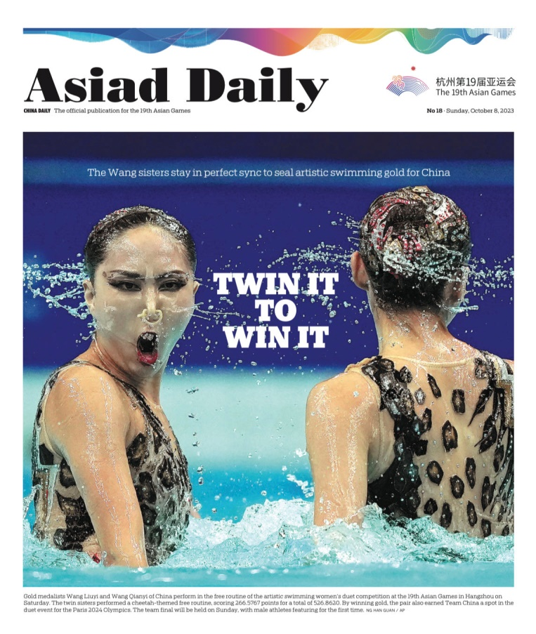 封面照片中,中国双胞胎(twin)姐妹花王柳懿和王芊懿凭借以一套猎豹为主题的表演摘得了花样游泳自由自选比赛的桂冠。Twin it是一款游戏的名字,有一起做的意思,除去字母t,正好是win it,意为一起去赢。