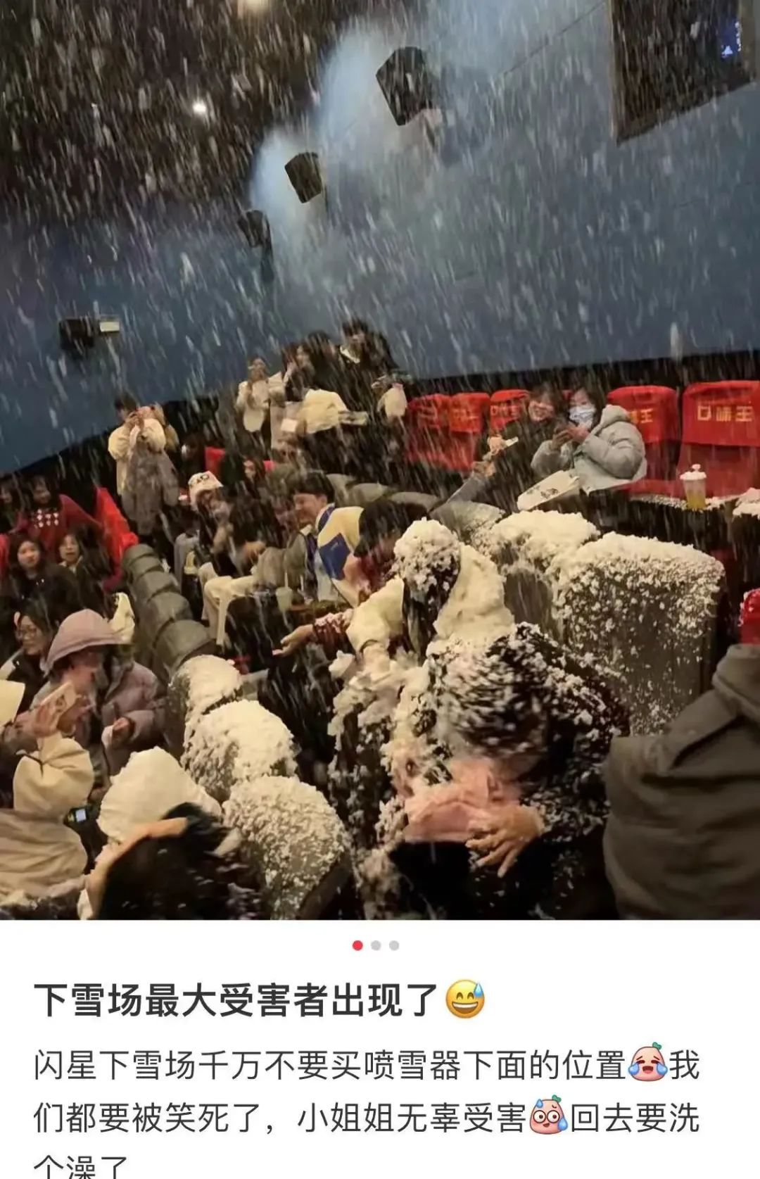在有些电影院里,说好的是甜蜜浪漫场,观众却被这波“暴雪”变成“雪饼”:“大家都在喊不要下了”。
