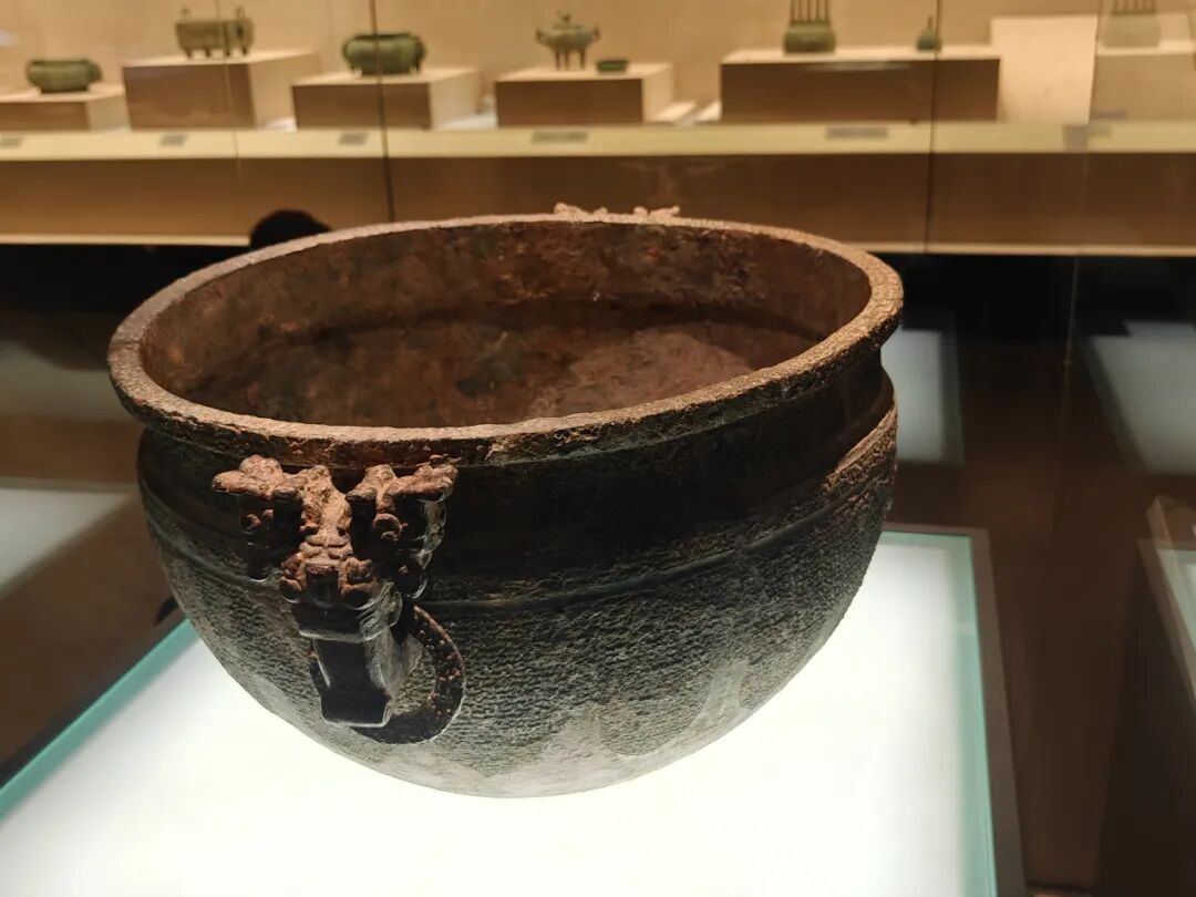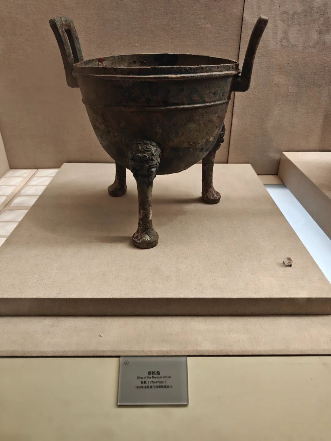 当时楚国问鼎中原,吴国和周边小国都打不过楚国,忌惮楚国的强大。在安徽博物院三层的常设展中可以看到另外两件形制截然不同的青铜器——蔡侯鼎、楚大鼎。蔡侯鼎器型纤细,显示出蔡侯在楚国面前谦卑懦弱。而楚大鼎(又称铸客大鼎)威武雄壮,通高 113 厘米,口径 93 厘米,重约 400 公斤,在所有出土的青铜器中容积最大。楚霸王的雄风,历历在目。