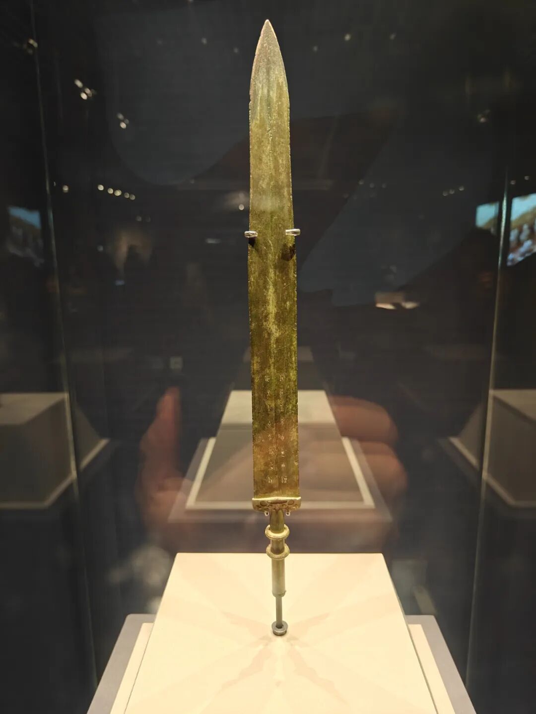 剑光依旧凛冽,剑身稍有锈蚀,上有镶嵌绿松石花纹,剑首处的绿松石脱落了,但基本保存完好。剑身刻有大篆铭文 16 字——“攻吴王光自作用剑,恒余以至克肇多攻”,意思是,我吴王这个人,非常勇武,拿着这把宝剑,取得了很多战功。