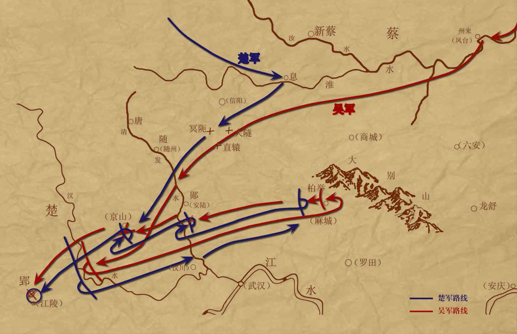 正是在伍子胥、孙武的辅佐下,公元前 506 年,吴王阖闾联合周边蔡、唐等十几个小国伐楚,沿水路北上,绕到楚军腹地,出其不意,一鼓作气,3万吴军打败 20 万楚军,以少胜多,造就了春秋战国著名战例“柏举之战”。《孙子兵法》中最著名的 “以迂为直”、“兵贵神速”、 “速战速决”等,无不在这一战中得到显著体现。