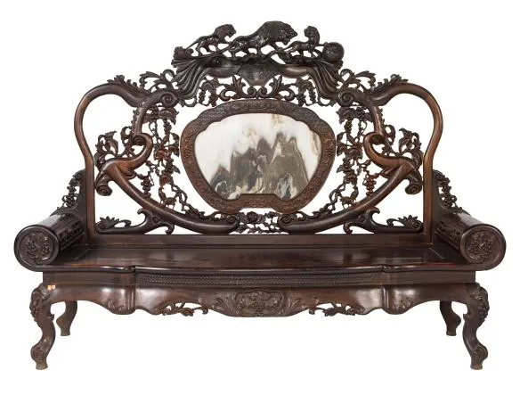 民国·酸枝嵌云石雕三狮推球葡萄纹贵妃榻