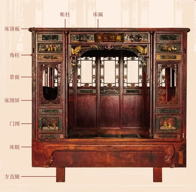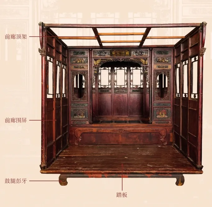 在中国传统床具中,私密性最强的莫过于拔步床。其形制高大,工艺精湛,功能完善,有如“房中之房”,可藏风聚气。拔步床结构复杂,前廊后床,以围屏、床顶板、门围、门等围合成屋。围屏下部皆封板,上部为景窗,设插板,并以插销来固定,便于采光与通风,设计巧妙。前廊门柱之上设撑拱,上面安装三重飘檐,仿建筑之样式,层叠立体。