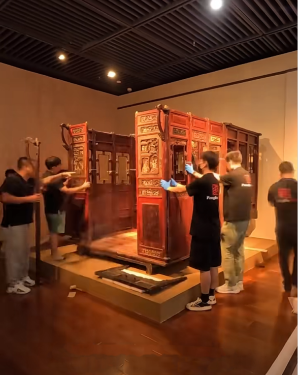 因古床体量巨大,对场地要求较高,这批古床先存放在某木器公司的库房,后又辗转在沙井、珠海等地。2019 年 11 月,张之先考虑到年事已高,为了不让这批珍贵的古床散失(曾有商人出高价希望购买其中的精美花板构件,被他断然拒绝),在福田区南园街道文化站史巧云站长的牵线搭桥下,决定将其捐赠给深圳博物馆。同年 12 月 17 日,深圳博物馆派出的专家团队和专业的文物运输公司人员一同赴珠海,经过四天的加班加点,进行拆卸、包装、搬运、装车,20 日晚古床顺利运回深圳,连夜入藏库房。至此,这批古床结束了四处辗转折腾、多次拆装受损的命运。