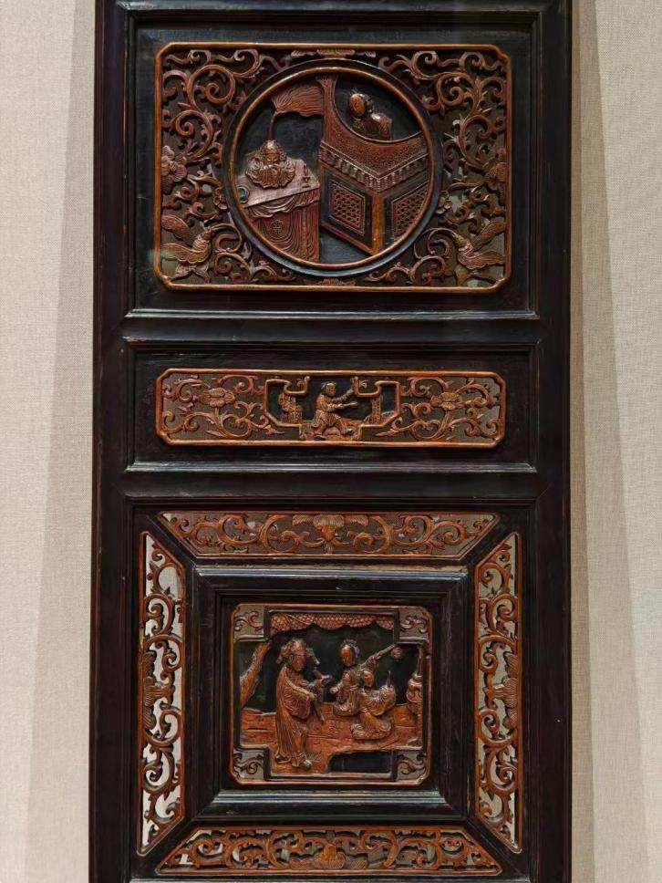 上:民国 朱金木雕黑漆描金花鸟人物故事纹后床围屏 张之先捐赠